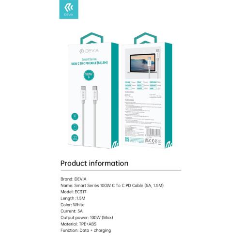 CAVO USB TYPE C 1.5MT 5A DI CARICA 100W DEVIA BIANCO
